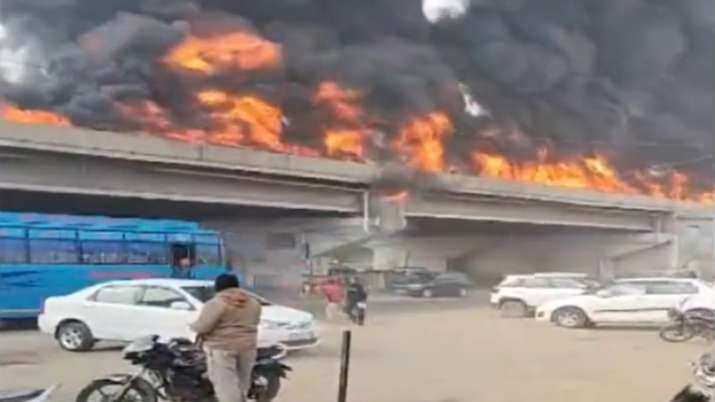 A significant fire incident unfolded near Khanna in Punjab as a fuel tanker overturned on a flyover, causing a massive blaze. Despite the flames spreading across the flyover, traffic below continued to operate normally. Firefighting teams, comprising 4-5 fire tenders along with civil and police administration, swiftly responded to the emergency after receiving information about the incident around 12:30 pm. Fortunately, no casualties or injuries have been reported, and the situation is currently under control.